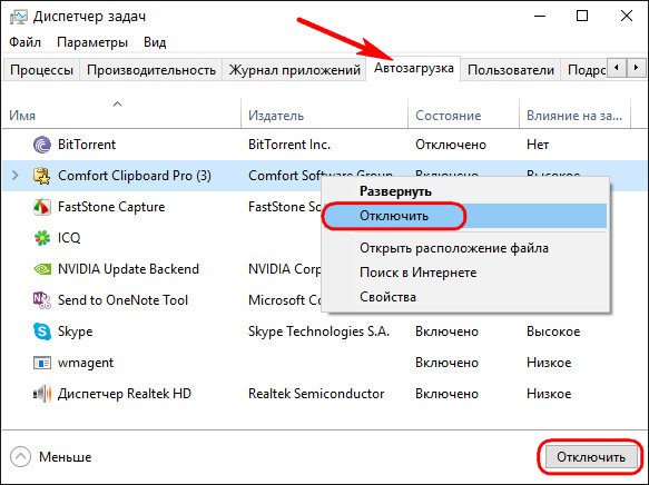 Откроется окно диспетчера задач на нужной вкладке «Автозагрузка». Здесь необходимо поочерёдно отключить каждый объект автозагрузки. Опция отключения станет доступной при вызове на каждом из них контекстного меню. Или можно использовать кнопку «Отключить» внизу окна.