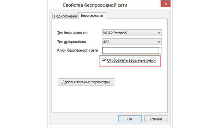 - Перейдите во вкладку «Безопасность» и поставьте галку «Отображать вводимые знаки». В поле рядом вы увидите пароль от вашего вай-фая.