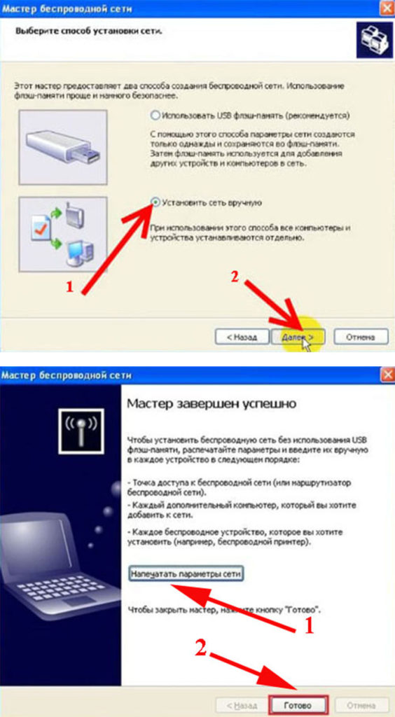 В итоговом окне мастера настройки беспроводной сети Windows XP нажмите «Напечатать параметры сети».