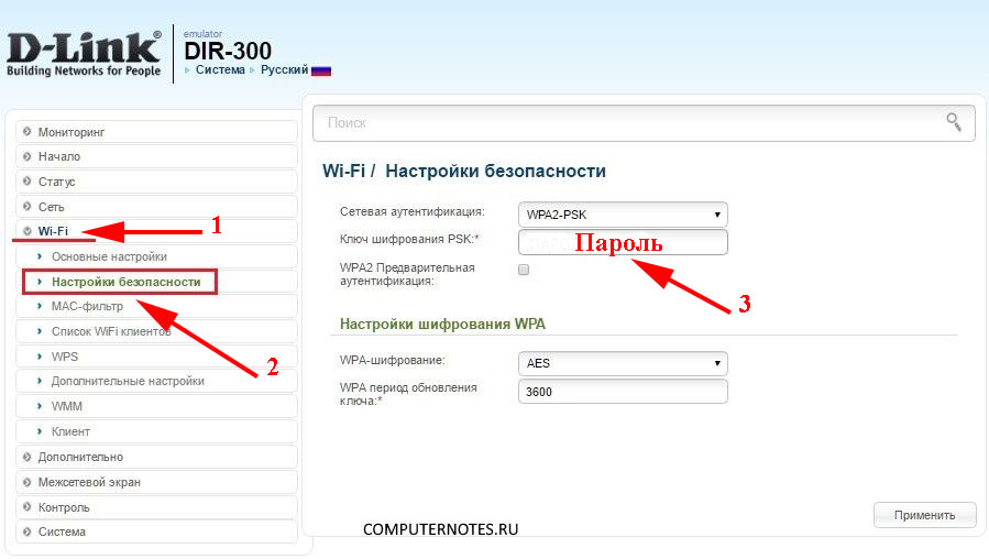 Для того, чтобы посмотреть или поменять пароль Wi-Fi на роутере D-Link перейдите в вертикальном меню на закладку «Wi-Fi» — «Настроки безопасности», как показано на скриншоте ниже.