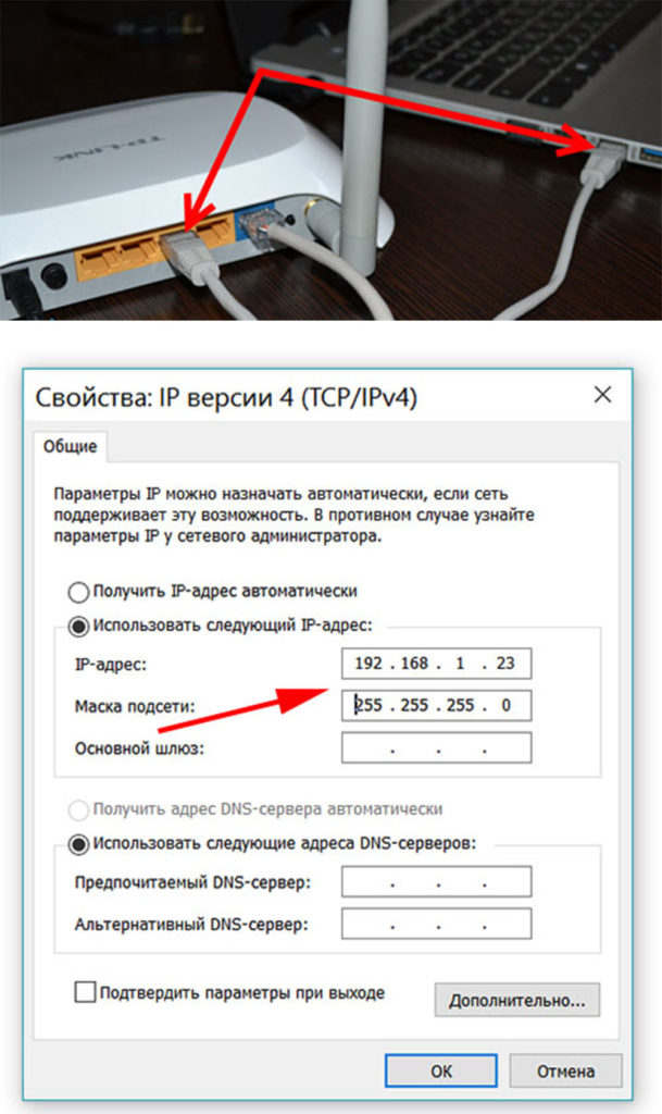 - Необходимо чтобы роутер был подключенный к компьютеру сетевым кабелем или можно зайти вай фаем. Прописываем на сетевой карте IP и маску, к примеру (IP – 192.168.1.23, Маска 255.255.255.0)