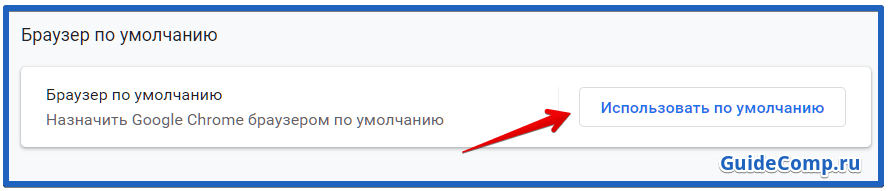 - В Google Chrome нам нужно перейти в «Настройки» и листаем список до пункта «Браузер по умолчанию» в нём нажимаем «Использовать по умолчанию»,