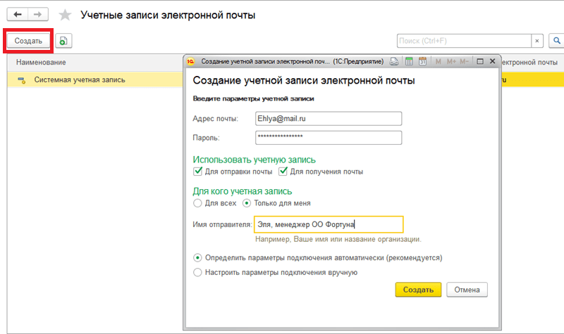 Если все было сделано правильно, то в программе 1С с этим паролем будет создана учетная запись Яндекса, которая должна пройти проверку авторизации.