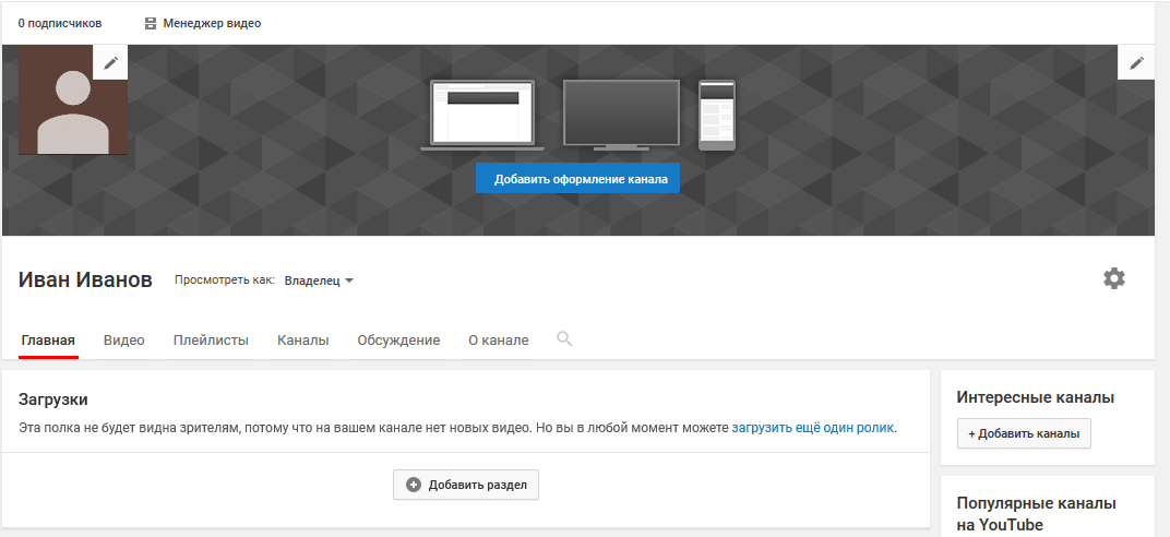 Первое, что видит человек, заходя на канал, это «обложка». Она должна понравиться и заинтересовать. Это достигается с помощью упорядочивания содержимого в разделах Главная, Видео, Плейлисты, Каналы, Обсуждение, О канале.