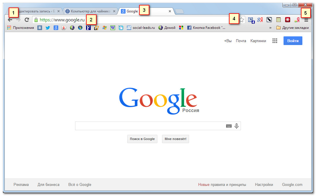 - Средняя строка состоит из 3 элементов управления — «Назад», «Вперед» и «Стоп / Обновить». Здесь поле URL-адреса также предназначено для поиска, а также значок закладки в виде звездочки. В правой части окна URL-адреса имеются расширения и значки настроек.