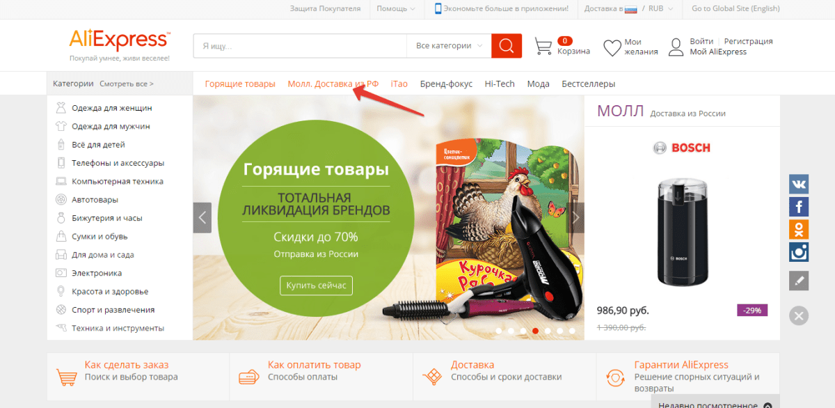Первый этап – необходимо выбрать товар и отправить его в корзину либо купить сразу. Перед покупкой товара, обязательно нужно зарегистрироваться на сайте алиэкспресс и пройти авторизацию. Либо зайти в уж существующий аккаунт, через социальные сети или используя электронный адрес.
