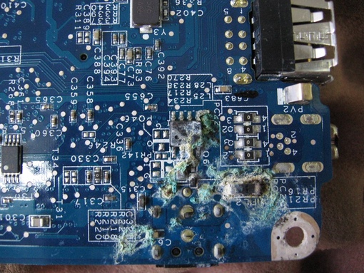 Даже если сразу после того, как был залит ноутбук, удалить жидкость с корпуса и перевернуть ноутбук вверх дном для просушки, часть жидкости все же проникает на его материнскую плату. С корпуса ноутбука жидкость быстро испаряется, а вот внутри ноутбука начинается процесс коррозии. Именно поэтому очень важно отдать залитый ноутбук в сервисный центр как можно скорее, поскольку с каждым часом коррозия захватывает все большую поверхность материнской платы. Чипы на материнской плате как губки затягивают под себя влагу, и, если быстро не принять меры, то ремонт ноутбука станет дорогостоящим либо вообще нецелесообразным из-за высокой цены. Нередки случаи, когда после попадания жидкости ноутбук работает нормально в течение нескольких дней, что заставляет думать, что проблема решена. Однако через две-три недели ноутбук включаться отказывается. После обращения в сервисный центр владелец узнает о том, что внутренности ноутбука изъедены коррозией.