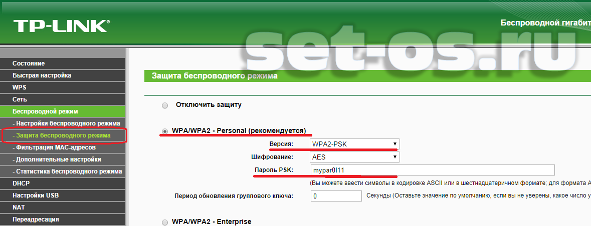 Там будет подраздел Security (Безопасность), где надо найти параметр Version (Версия) или Type (Тип, метод проверки) и выставить его в значение WPA-PSK/WPS2-PSK mixed или только WPA2-PSK. А затем в поле Password, Passphrase или Key ввести пароль на Вай-Фай и сохранить настройки. И всего делов-то! А теперь примеры: