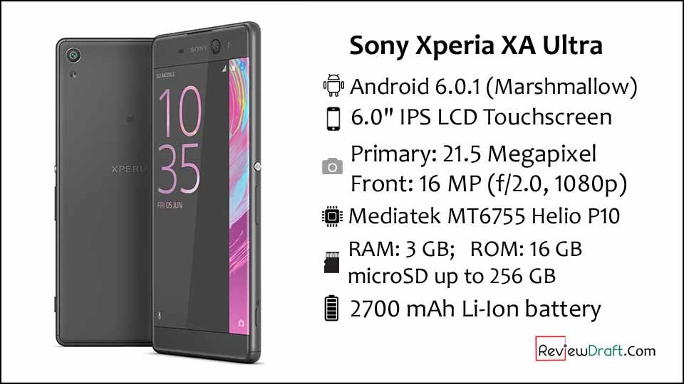 Sony объявила о выпуске смартфона Xperia XA Ultra в 2016 году. Производитель предлагает телефон Sony Xperia XA Ultra с 6-дюймовым дисплеем, чипсетом Mediatek Helio P10 MT6755, 3 ГБ оперативной памяти и 16 ГБ встроенной памяти.