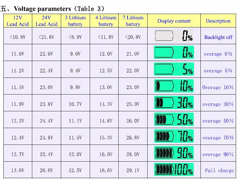 Напряжение полностью исправной и заряженной 12-вольтовой кислотно-свинцовой батареи — 12.7-13.2 Вольт. У полностью разряженной батареи напряжение примерно 10.5 Вольт. Достаточно несколько раз полностью разрядить батарею и такой аккумулятор станет непригоден для использования. Поэтому для длительной эксплуатации аккумулятора важно не разряжать батарею ниже 12-12.05 Вольт, что равно примерно половине емкости. Желательно установить ограничители напряжения для отключения отдачи энергии при достижении заряда в 12 Вольт.