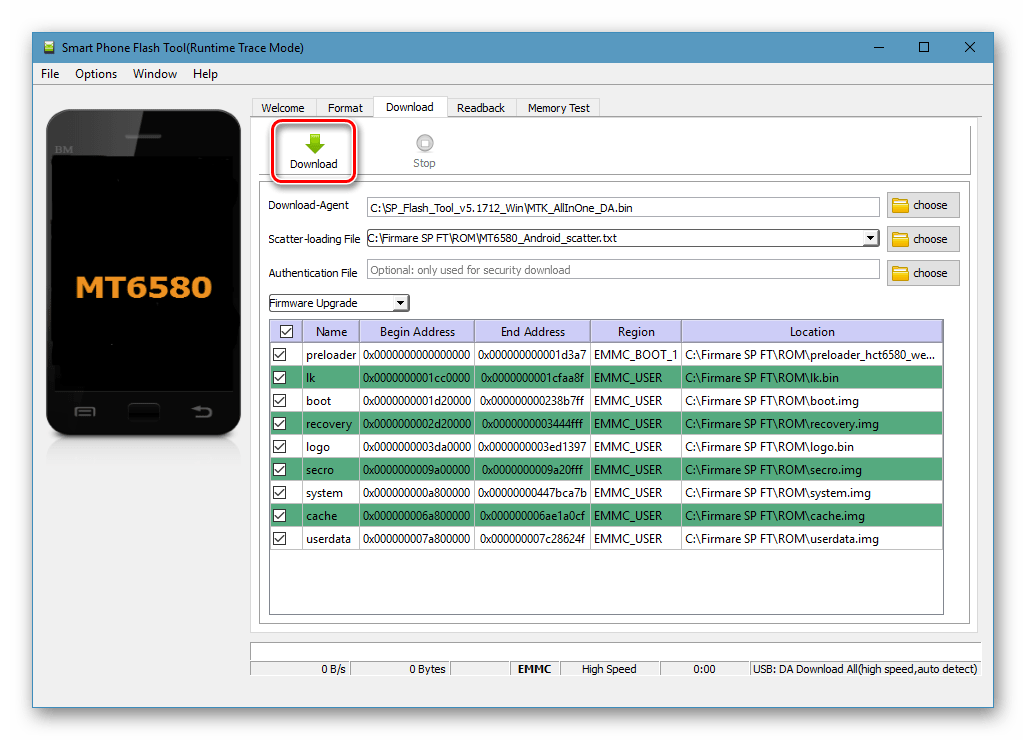 - Download only — прошивка без переразметки памяти. Память в смартфоне уже размечена и прошивка будет производится по старым адресам новыми файлами. Плюсы: можно прошить отдельные файлы, например только recovery, можно не прошивать файл userdata и тем самым сохранить пользовательские данные. Минусы: часто обновления прошивок отличаются размером и по старых адресах не влазят — программа выдаст ошибку.