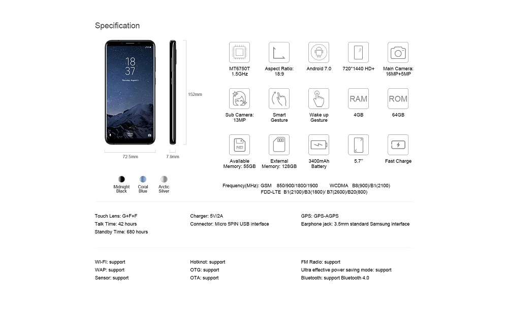 Производитель предлагает телефон HomTom S8 с 5,7-дюймовым дисплеем, чипсетом Mediatek MT6750T, 4 ГБ оперативной памяти и 64 ГБ встроенной памяти.